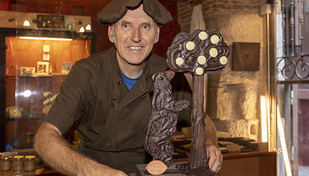 Preuve de cette fusion culturelle dont il est fier, vous trouverez ici des figures en chocolat aussi bien de Tintin et Milou que de l’ours et l’arbousier, symboles de Madrid. Sa spécialité sont les truffes fourrées aux saveurs variées (café, orange, noix de coco...), tout comme leurs enrobages.